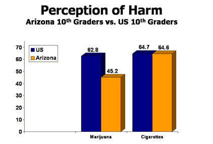 Authors of the survey say that “an explanation for this difference in use could possibly be gathered by comparing Arizona and national rates of perceived harmfulness of substances.” Arizona students perceive less risk in using marijuana, but more risk in smoking cigarettes than their national counterparts.